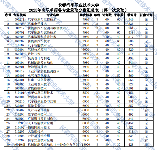 长春汽车职业技术大学2025年高职单招征集计划 | ||||||